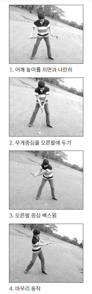 사진1에서 확인 하듯이 셋업은 내리막 라이와 마찬가지로 어깨의 높이를 지면과 같이 해야 한다. 그러면 내리막 라이와 반대로 어깨가 만들어지게 되며, 기울어진 어깨는 볼을 더 높게 띄우게 된다.