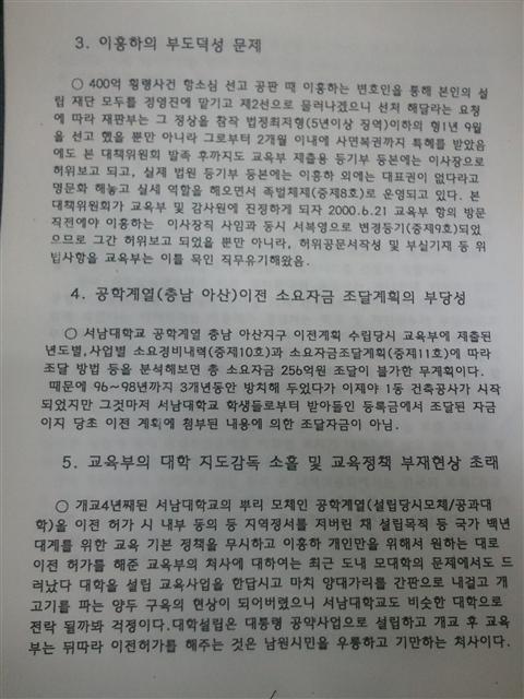 대책위는 이어 "99년 국정감사 때 이 대학의 문제점을 고(故) 이수인 의원이 지적했음에도 이를 방치하였을 뿐만아니라 각종 시설물(실험, 실습기자재 등)의 부족(감독관청의 확인감사 때는 이를 속임수로 대체이동) 등 교육환경여건이 열악함에도 이를 묵인 방조하고 있다"며 교육부의 대학 지도감독 소홀 및 교육정책 부재현상 초래를 청원서에 새겼다.