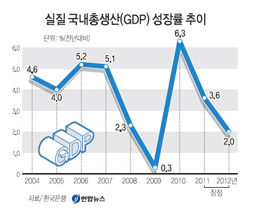 한국은행이 24일 발표한 '2012년 4분기 및 연간 국내총생산(속보)'을 보면 작년 실질 국내총생산(GDP)은 2011년에 비해 2% 늘었다. 2011년 성장률(3.6%)를 크게 밑돈 수치다. 한은이 당초 예상한 성장률 2.4%보다도 0.4%포인트 모자란다. 이에 따라 우리나라의 GDP 성장률은 금융위기 때인 2009년(0.3%) 이후 3년 만에 최저치를 기록했으며 2008년(2.3%) 이후 4년 만에 다시 2%대로 주저앉았다.