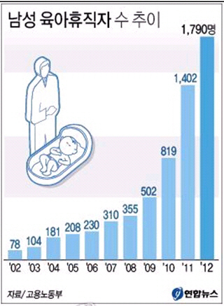 2001년 2명뿐이던 남성 육아휴직자는 제도가 본격적으로 시행된 2002년에도 78명에 그쳤다.이후 2003년 104명, 2004년 181명, 2005년 208명, 2006년 230명, 2007년 310명, 2008년 355명 등으로 서서히 증가했다. 그러다가 2009년 502명, 2010년 819명, 2011년 1천402명으로 큰 폭으로 늘고 있다.