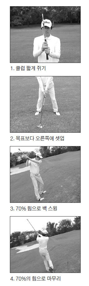 오르막 라이 샷 - 두 클럽 크게 잡고 가볍게 스윙