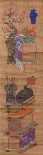 책거리 그림'이라고도 불리는'책가도(冊架圖)'는 책은 물론 각종 골동품이나 문방구, 꽃 등 여러 물품들을 그린 그림. 정조대(1776~1800)에 궁중화원들에 의해 시작된 것으로 추정되고 있으며, 조선 후기에 궁중이나 상류계층에서 크게 유행했다.