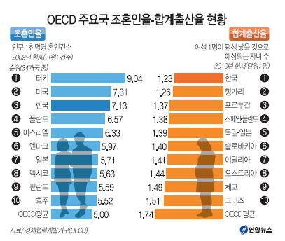 합계출산율은 2010년 1.23명에 그쳐 OECD 34개 회원국 중 꼴찌였다. 합계출산율은 여성 1명이 평생 낳을 것으로 예상되는 자녀 수의 기대값이다.