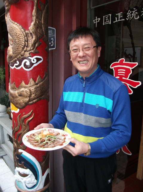 ▲ 중국 산둥성 출신 유영백씨가 고기 전가복 요리를 들어 보이고 있다.