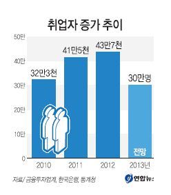 7일 금융투자업계와 한국은행, 통계청 등에 따르면 우리나라 취업자 증가 수는 2010년 32만3천명, 2011년 41만5천명에 이어 작년에는 43만7천명에 달했다.
