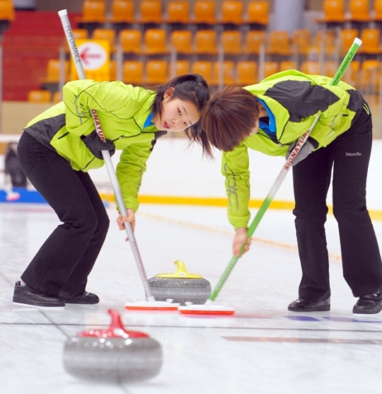 제94회 전국동계체전 사전경기를 하루 앞둔 12일 전주 화산실내빙상경기장에서 전북 컬링 선수들이 실전 같은 연습을 하고 있다.