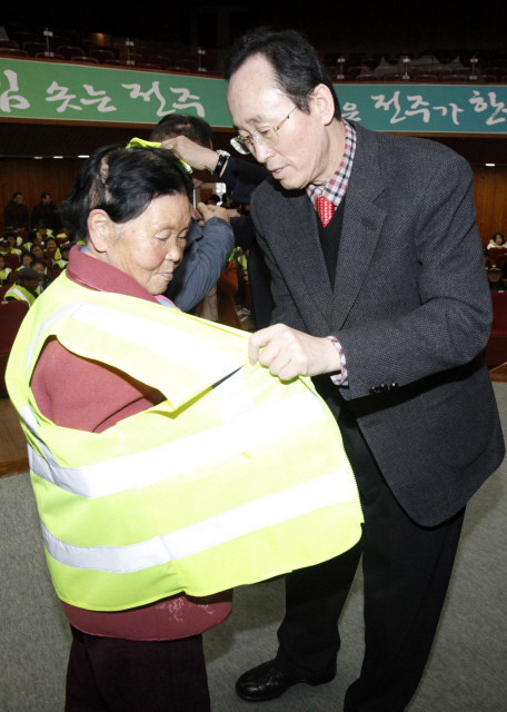 12일 오전 전주시청 강당에서 열린 폐지수거 노인 야광안전조끼 전달식에서 송하진 전주시장이 한 어르신에게 야광조끼를 입히고 있다. 이날 행사는 대한노인회 전주시지회(지회장 오경남)가 주관하고 전북사회복지공동모금회(회장 이종성)가 후원했다.