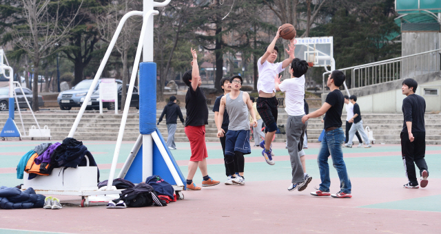 일주일만에 날씨가 영상권을 회복한 13일 전북대학교 농구장에서 학생들이 점퍼를 벗어놓고 반팔차림에 농구를 하고 있다.