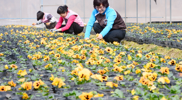 포근한 날씨를 보인 14일 전주 우아동 전주시립양묘장에서 직원들이 봄꽃 출하시기에 맞춰 노란 팬지꽃의 새순을 따고 있다. 팬지는 향긋한 봄내음을 뽐내며 3월초에 도심 곳곳에 배치될 예정이다.