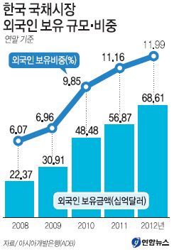 17일 금융투자업계와 아시아개발은행(ADB) 등에 따르면 외국인의 한국 국채 보유 규모는 작년 말 현재 686억달러로 사상 최대치를 기록했다. 2008년 말 이후 4년 만에 3배 이상으로 늘었다.