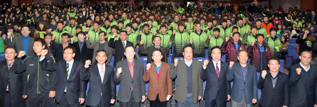 ▲ 16일 전북도청 대공연장에서 열린 2013 전북현대모터스FC 출정식에서 참석자들과 선수들이 파이팅을 하고 있다. 전북도청 제공