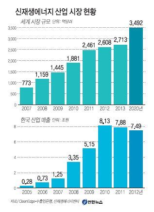 그러나 한국의 신재생에너지 산업은 내리막길을 걷고 있다. 2010년을 정점으로 올해까지 3년 연속 매출이 감소할 것으로 전망됐다.