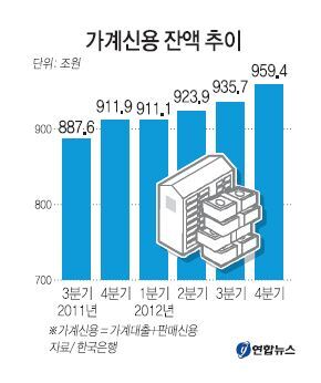한국은행이 21일 발표한 '2012년 4분기 중 가계신용'으로는 작년 말 기준 우리나라 가계신용 잔액은 959조4천억원이다. 전분기보다 23조6천억원 증가한 것으로 역대 최고치다.