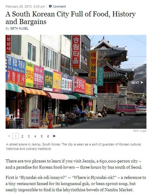 지난 6~8일 전주를 둘러본 뒤 맛과 멋에 푹 빠진 세스쿠겔 뉴욕타임즈 가 쓴 20일 자 기사에는 '전주엔 맛없는 음식도, 식당도 없었다'고 역설적인 평가를 내놨다. '전주는 한식 식도락가들을 위한 천국'이라는 그의 극찬을 뒷받침한 것은 5000원에 숙취를 해결할 수 있는 콩나물국밥, 신선한 재료들로 가득 채워지는 전주비빔밥, 반찬이 끊임없이 리필되는 백반집 등이었다. 6~7만원이면 친절한 서비스로 한옥 민박이 가능하다는 점이나 조선왕조의 본향으로 태조 이성계의 어진이 봉안된 경기전 등 명소가 가득했으나 곳곳에 영어로 된 안내가 없다는 것은 '옥의 티'라고 덧붙였다.