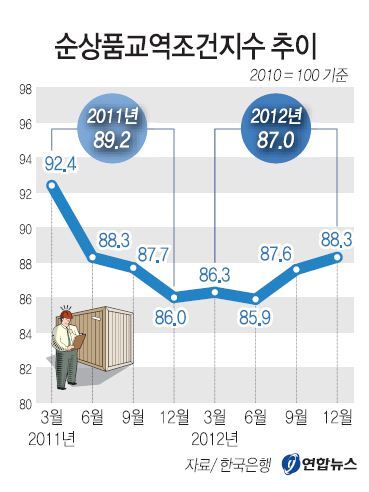 한국은행이 25일 내놓은 '2012년 중 및 2013년 1월 무역지수·교역조건' 자료를 보면 순상품교역조건 지수는 지난해 87.0으로 전년(89.2)보다 2.4% 떨어졌다. 이는 지난해(100→89.2)에 이어 2년 연속 악화한 것이다.
