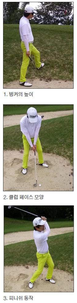 따라서 사진과 같이 높은 벙커에 볼이 있다면 부드러운 스윙으로 피니쉬의 높이를 높이는 것을 기억하자.
