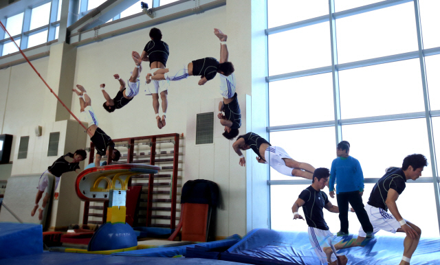 양학선은 27일 서울 공릉동 태릉선수촌에서 그에게 런던올림픽 금메달을 안겨준기술 중 하나인 '쓰카하라 트리플'에서 반 바퀴를 더 도는 신기술을 선보였다.