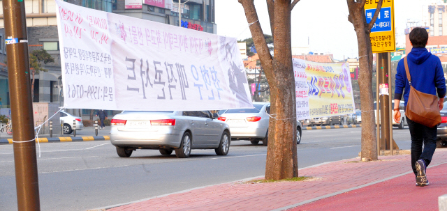 27일 전주 덕진구 한 인도에 불법 현수막이 걸려 있으나 단속이 이루어 지지않은채 방치되어 있다.