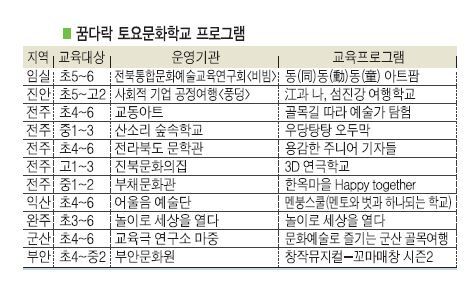 지난해 주5일제 수업이 전면 시행됨에 따라 학교 밖 문화예술교육 정착과 활성화를 목적으로 시작된 꿈다락 토요문화학교는 지역 문화자원을 활용한 기획프로그램, 청소년·가족단위 문화예술교육 프로그램 등으로 꾸려진다.