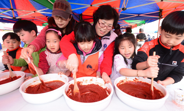 지난 28일 전주 오거리 문화광장에서 열린 전주시민 고추장 담그기 행사에 참석한 아이들을 비롯한 가족들이 빨간 고추장을 직접 만들고 있다.