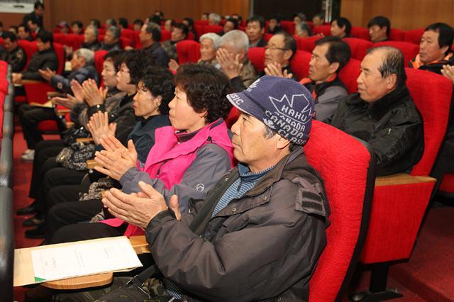 ▲ 지난달 28일 열린 무주과수영농조합법인 제8차 정기총회에서 참석자들이 올 사업계획에 대한 보고를 듣고 박수를 치고 있다. 사진제공=무주군