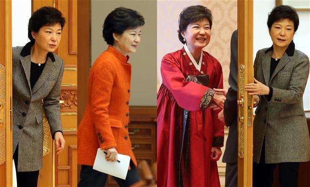 박근혜 대통령이 취임한지 1주일이 지났다. 박 대통령은 이 기간 의전이나 행사 준비 등에서 이전 대통령에게서는 볼 수 없었던 여러 모습을 보여주었다. 외교사절을 기다리는 동안 집무실에서 접견실로 통하는 문을 갑자기 열어 대기중이던 비서관에게 손님 도착여부를 묻고 있으며(왼쪽 첫번째), 수석비서관회의에 참석하면서 발언내용을 담은 메모지와 필기구를 직접 들고 입장하고 있으며(두번째), 취임 만찬 때는 한복을 차려 입고 손님들을 맞이하고 있고(세번째), 집무실에서 접견실로 들어설 때 의전이나 경호원이 문을 열어주는 관례를 깨고 직접 문고리를 잡아 문을 열고 입장하고 있다 (네번째). 연합뉴스