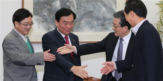 새누리당 이한구 원내대표와 민주통합당 박기춘 원내대표가 3일 오전 국회에서 정부조직 개편안 협상을 재개하기 위한 원내대표 회동을 하며 악수하고 있다. 왼쪽부터 민주통합당 우원식 원내수석부대표, 박기춘 원내대표, 새누리당 이한구 원내대표, 김기현 원내수석부대표. 연합뉴스