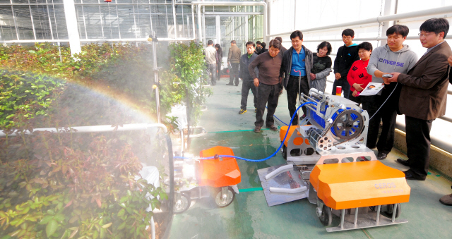 5일 전주 로즈피아에서 열린 농업용 방제 로봇 시연행사에서 로봇이 화훼류 방제 작업을 하고 있다.
