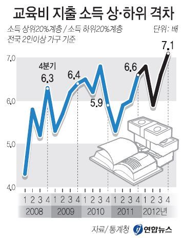 같은 기간 소득 하위 20% 계층이 지출한 교육비는 고작 5만7천원이다. 두 계층 간 지출 격차가 무려 7.1배나 된다. 관련 통계가 이뤄진 2003년 이래 최고치다.