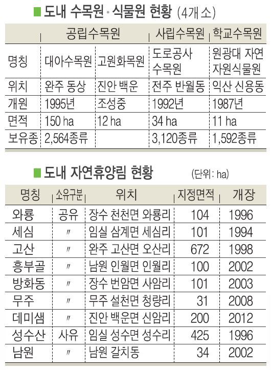 대표적으로 지난 1995년 완주군 동상면 150ha에 조정된 대아수목원에는 2546종류의 수목이 관리 보존되고 있다. 고속도로 공사를 추진하면서 사라지게 될 나무들을 보존하기 위해 조성한 한국도로공사수목원은 전주시 반월동 34ha에 수목 3120종을 보유하고 있다.