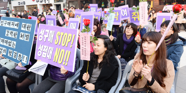 '빈곤과 폭력없는 세상으로'를 슬로건으로 내세운 이날 대회에서 참석자들은 '성구매 STOP, 성접대 NO', '성구매자들에 대한 강력한 처벌, 성매매없는 세상의 첫걸음' 등이 적힌 피켓을 들고 목소리를 높였다.