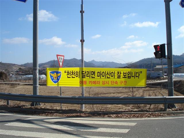 신규 이동카메라 단속에 앞서 지난 2월 말에 사고다발지역 9개소에 내건 이 플래카드에는 "천천히 달리면 마이산이 잘 보입니다"라고 새겨져 있다.