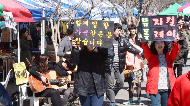 8일 전북대학교 교정에서 재학생들이 피켓 등 소품을 이용해 동아리 신입회원을 모집하고 있다.