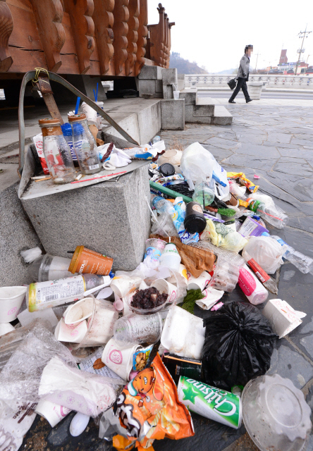 13일 전주 한옥마을 남천교의 청연루 앞에 시민들이 버리고간 음료수 캔과 빈 커피통들이 바닥에 버려져 있다.