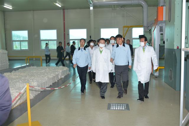 ▲ 지난 15일 '열린마당 희망투어' 삶의 질 향상 방안 토론회 일환으로 순창을 방문한 김완주 지사가 한국C&T 방적공장을 둘러보고 있다.