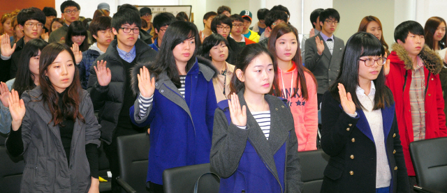 18일 전주시 현대해상 회의실에서 열린 드림스타트 저소득층 아동 지원을 위한 멘토링 서약식에서 대학생들이 멘토 서약을 하고 있다.