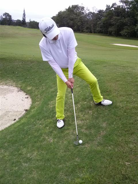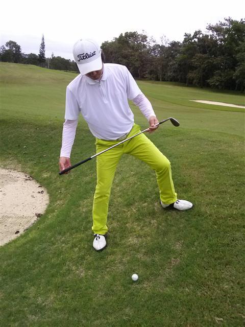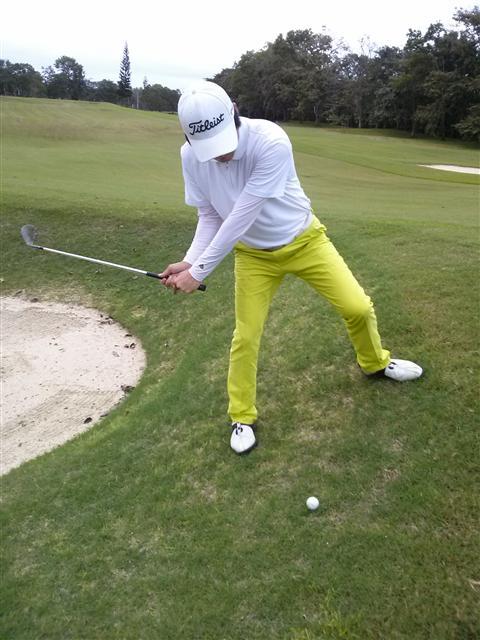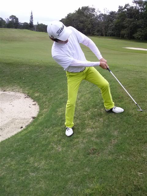 사진3은 백스윙 자세인데 체중의 움직임 없다는 것이 키포인트이다. 체중은 낮은 발에 두고 백스윙동안 움직이지 않고, 마무리동작에서도 체중은 사진4와같이 낮은 발에 계속 남아있어야 한다. 그리고 클럽을 높게 들어 올릴 필요가 없다. 피니쉬를 높게 하지 않아도 볼은 공중으로 높게 솟구치므로 부드럽게 피니쉬를 잡아주는 것이 좋다.