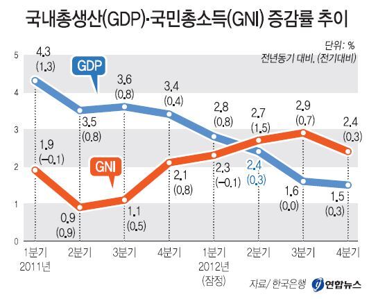 한국은행이 26일 발표한 `2012년 국민계정(잠정)'에 따르면 지난해 전년대비 실질 GDP 성장률은 2.0%로 2011년의 3.7%의 절반 가까운 수준으로 크게 떨어졌다.