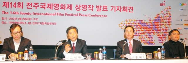 ▲ 26일 전주영화제작소에서 열린 제14회 전주국제영화제 상영작 발표 기자회견에서 송하진 전주시장과 고석만 집행위원장, 프로그래머들이 개막작에 대한 설명을 하고 있다. 올해 전주국제영화제는 다음달 25일부터 9일간 전주 영화의 거리 일대에서 펼쳐진다. 이강민기자 lgm19740@