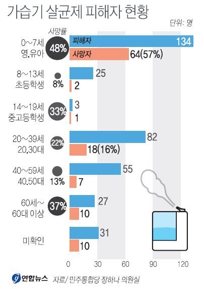 영유아 피해자 134명 중 절반이 넘는 64명이 사망했고, 60세 이상의 고령층 피해자 27명 중 10명이 사망한 것으로 집계돼 가습기 살균제로 인한 영유아와 고령층의 사망 확률이 높은 것으로 드러났다.