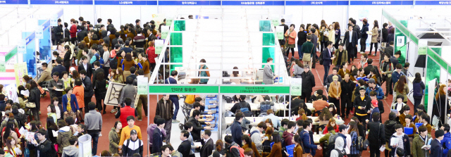 27일 익산 원광대학교 문화체육관에서 열린'2013년도 익산 GRAND 취업박람회'에서 구직자들이 취업정보를 얻기 위해 부스를 돌며 발품을 팔고 있다.
