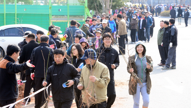 지난 30일 전북도청 야외주차장에서 열린 식목일 맞이 나무 나눠주기 행사에 참석한 시민들이 줄을 지어 나무를 받고 있다. ·