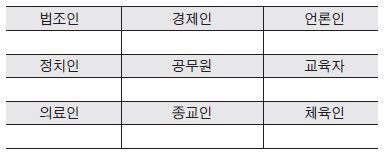▣ 다음은 우리 사회의 리더에 해당하는 분야의 사람들이다. 각 항목 중에서 가장 부패가 심한 부분은 어디인지 학급 내에서 설문조사를 실시해 보자.