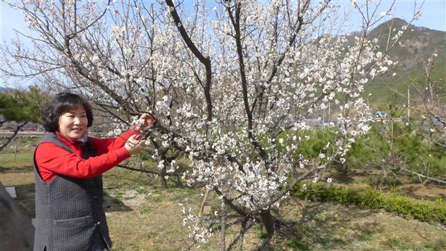 ▲ 완주군 경천면 가천리로 귀농한 김두순씨가 꽃봉오리를 막 터뜨린 매화꽃을 손질하고 있다.