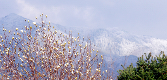 따뜻한 봄날이 계속되다 강풍 속 꽃샘취위가 시작된 7일 덕유산 자락에 하얗게 쌓인 설경뒤로 무주 안성면 금평마을에 수줍게 핀 목련꽃이 봄을 재촉하고 있다.