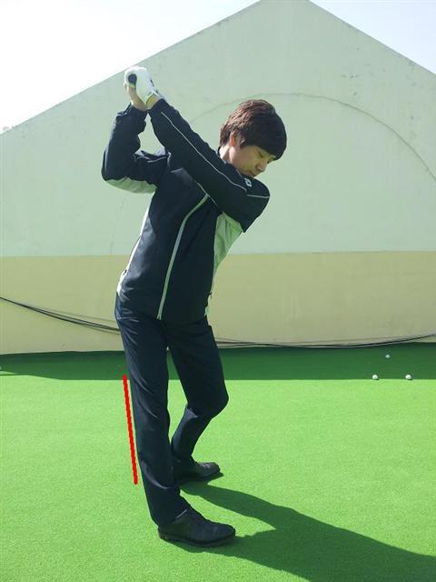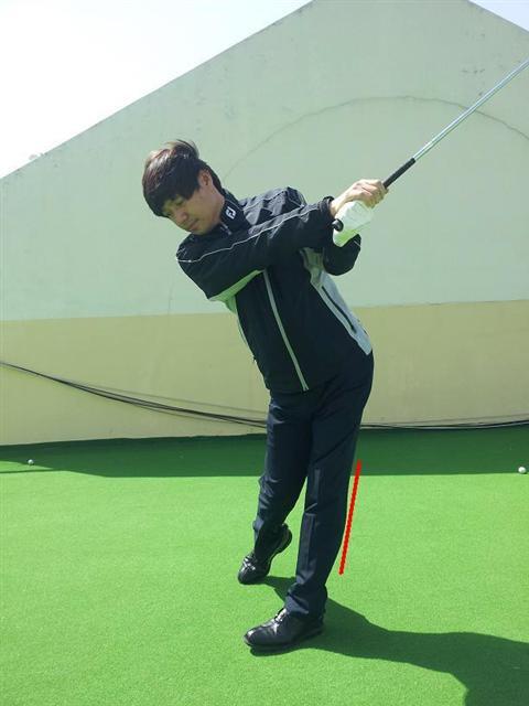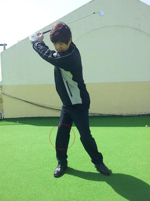 백스윙을 하면서 무릎의 동작은 사진1과같이 어드레스 때 만들어진 무릎의 높이를 지키려 하는 것이 필요하다. 사진2와같이 펴지게 되면 몸이 수직으로 움직이게 된다.