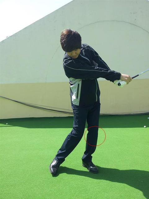 왼쪽 무릎은 임팩트 순간에 펴지지 않게 유지해야하는 것을 펴는 것으로 착각하여 무릎을 펴는 경우가 많다.