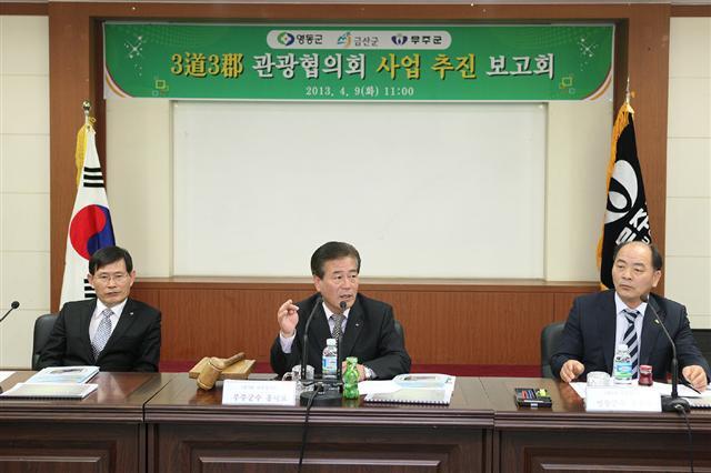 ▲ 지난 9일 열린 전북 무주·충남 금산·충북 영동'3도 3군 관광협의회'에서 홍낙표 무주군수(가운데)가 사업 추진에 대해서 보고를 하고 있다.