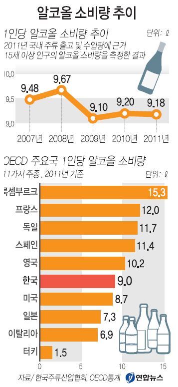 1인당 알코올 소비량은 2007년 9.48ℓ, 2008년 9.67ℓ, 2009년 9.1ℓ, 2010년 9.2ℓ으로 오르내림이 있지만 대체로 감소 추세를 보이고 있다. 2007년 통계작성을 시작한 이후 5년만에 3.2% 줄어든 셈이다.