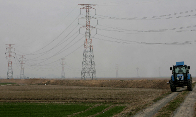 ▲ 군산~새만금 송전선로 건설현장인 군산시 회현면 금광리 만경강 들녘에 철탑공사가 한창 진행중인 가운데 농사 준비작업으로 논일을 마친 농민이 트렉터를 몰고 현장을 지나고 있다. 군산본부=오균진
